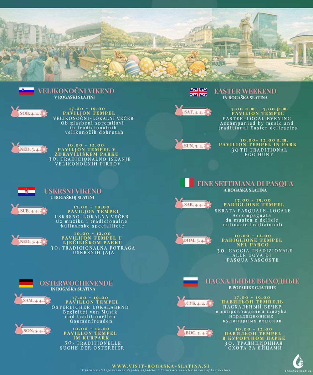 Nascosto in una valle verde, Rogaška Slatina con acqua minerale curativa famosa in tutto il mondo e un clima mite ha sempre offerto sano relax, pace, armonia e benessere. Oggi Rogaška Slatina è una destinazione attraente per tutti coloro che vogliono sperimentare gli effetti curativi dell'acqua minerale Donat, il benessere e la tranquillità circondati da una natura meravigliosa e da una ricca offerta culturale. È il luogo di incontro e di nuove conoscenze, dove le persone sono accomunate dalla voglia di vacanze di qualità, salute e relax. Questi sono solo alcuni dei motivi per visitare le sorgenti termali che si trovano in questa cittadina della Slovenia orientale.